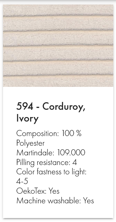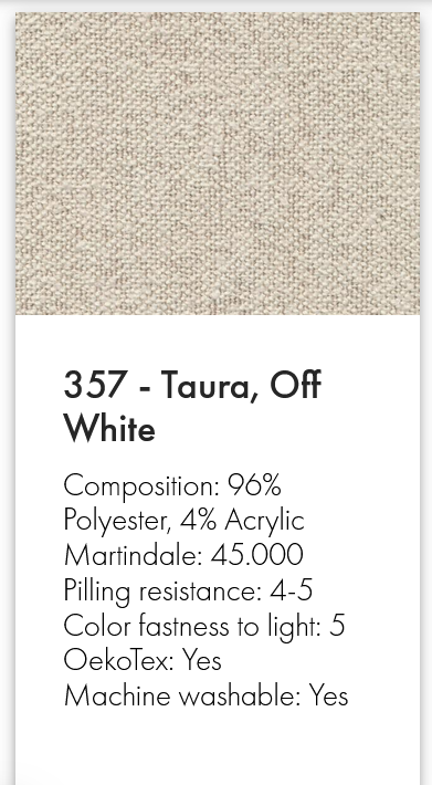 • Bezüge: Taura Off White 357 / Corduroy Ivory 594 / Boucle Taupe 530